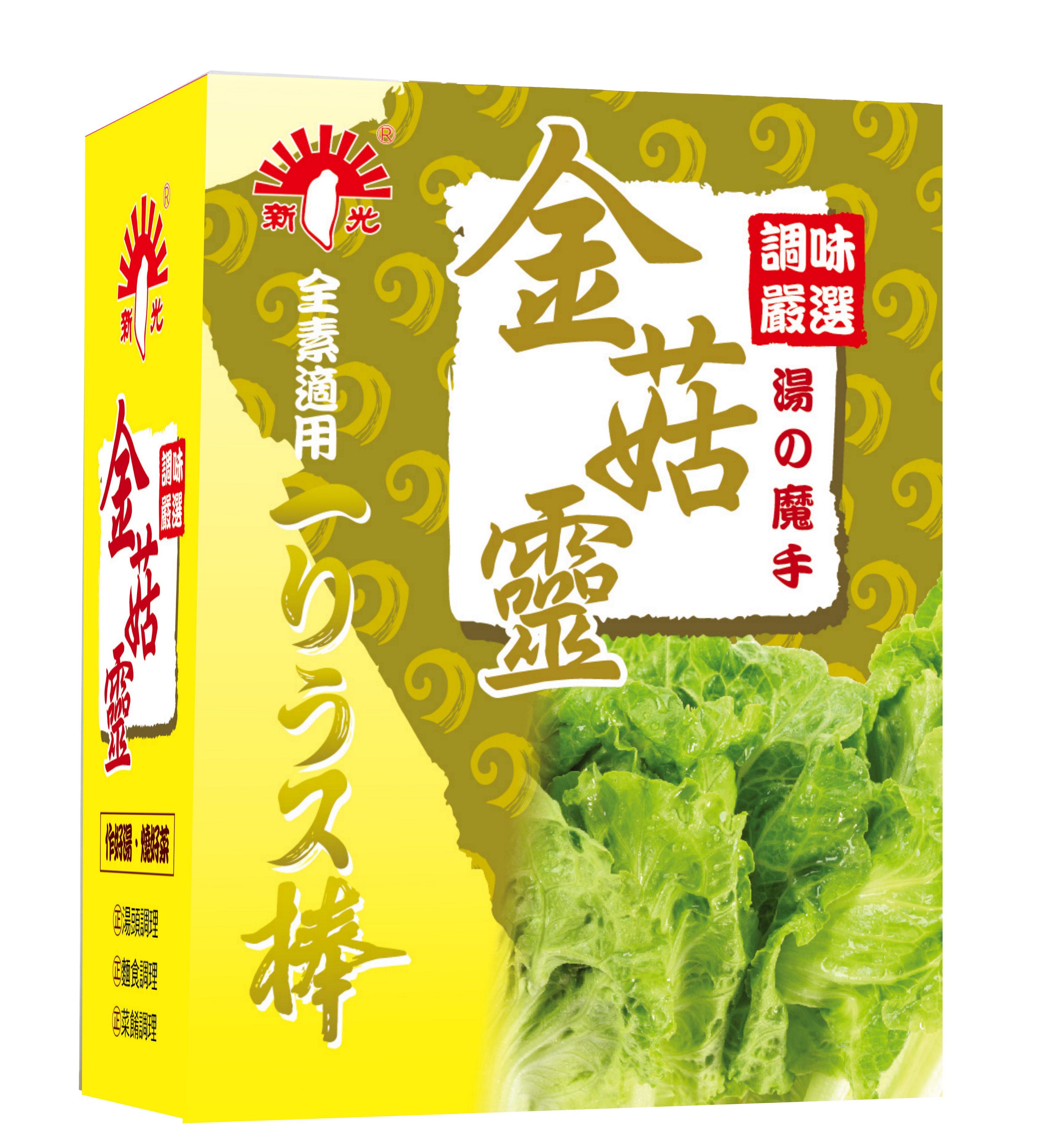 新光金菇靈的鮮度是一般味精數倍,故用量可大大減少,請酌量使用。